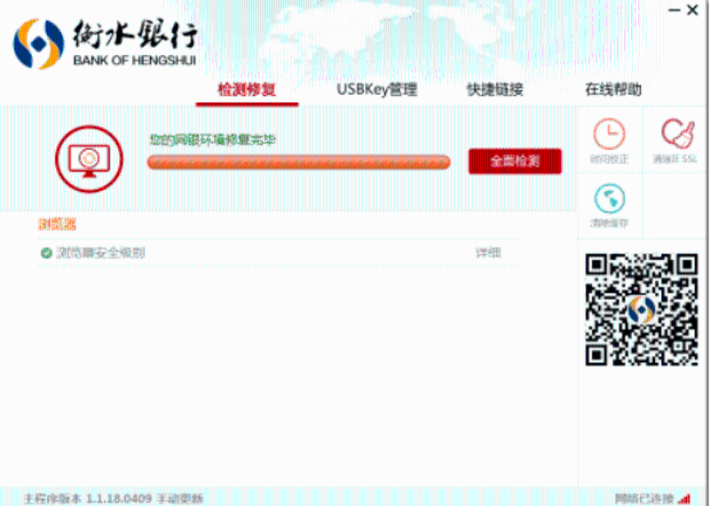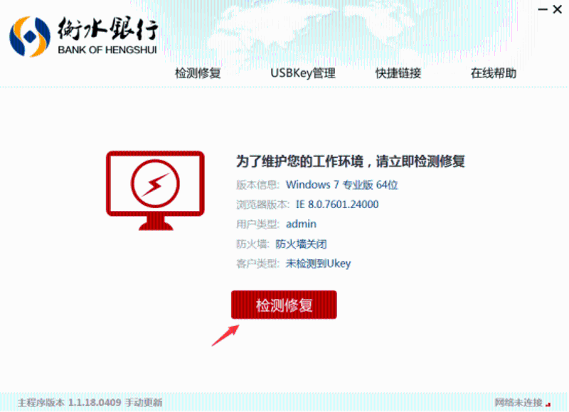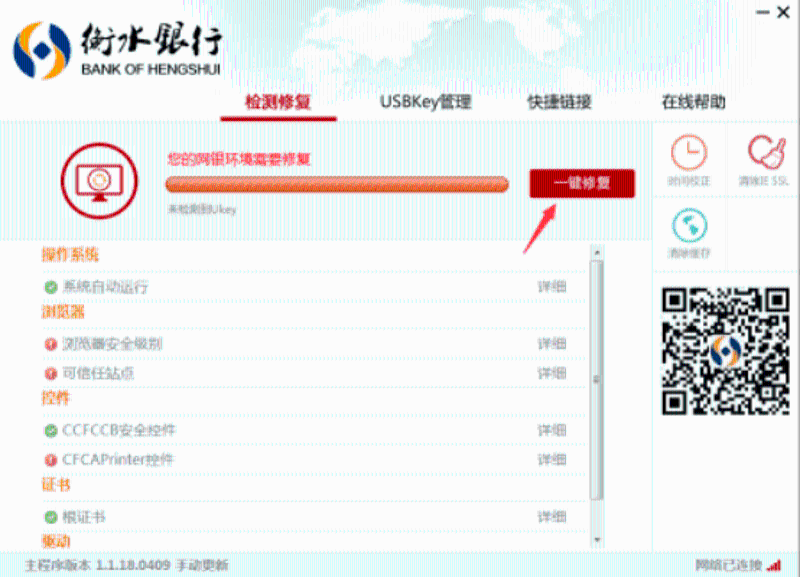 請(qǐng)您首次在登陸二代網(wǎng)上銀行系統(tǒng)之前,到衡水銀行官網(wǎng)首頁(yè)左側(cè)點(diǎn)擊“網(wǎng)銀助手”進(jìn)行系統(tǒng)檢測(cè)、修復(fù),如不進(jìn)行網(wǎng)銀助手修復(fù)工作可能會(huì)對(duì)使用二代網(wǎng)上銀行系統(tǒng)造成不便。網(wǎng)銀助手主要對(duì)電腦的操作系統(tǒng)、IE瀏覽器配置、安全控件、根證書等相關(guān)內(nèi)容進(jìn)行檢測(cè)并修復(fù),檢測(cè)、修復(fù)工作將有助您正常使用二代網(wǎng)銀,檢測(cè)、修復(fù)完成后請(qǐng)立即重啟計(jì)算機(jī)。如下圖所示: